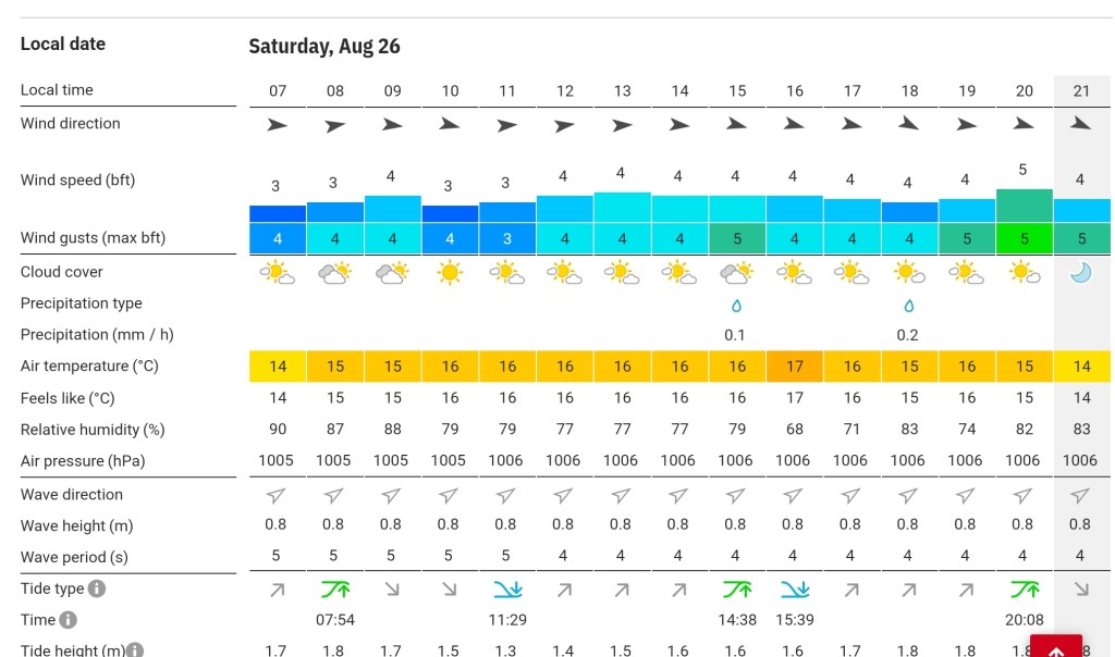 Tomorrows wind is about 11 to 17 knots from SW. making it a pretty good run / broad reach. (Fast) moderate sea state, raining most of the day