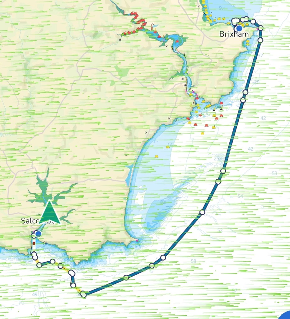 Again this turned out nothing like the passage plan, the wind being much stronger than predicted. The forecast doesn’t take account of how headlands accelerate and alter the direction of the wind. I guess knowing that I should have taken it into account, The upshot was another longer than expected passage and after employing the “iron sail” we eventually arrived at Salcombe about 7pm.