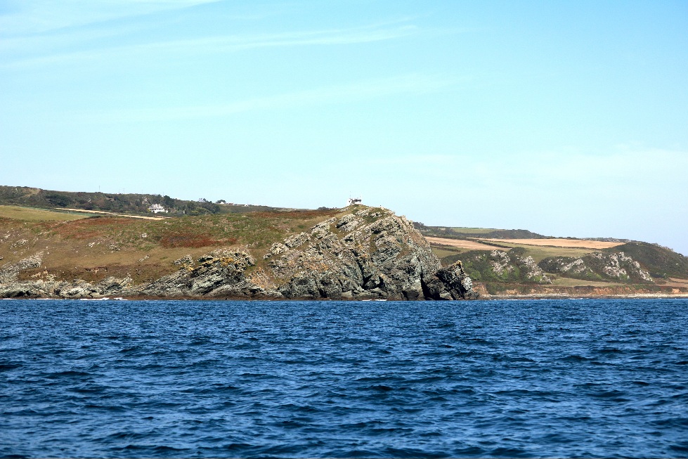 We left on the stroke of 8 am and motored out of the Helford river past the Royalist training ship anchored at the entrance. We were rewarded in the first four hours by lots of fair tide giving us an additional 4kts as we went past Lizard Point. The wind was reasonable at first but later died and went onto the nose. The engine was employed most of the way to boost the speed as we should have left at 6am and wanted to make good time.