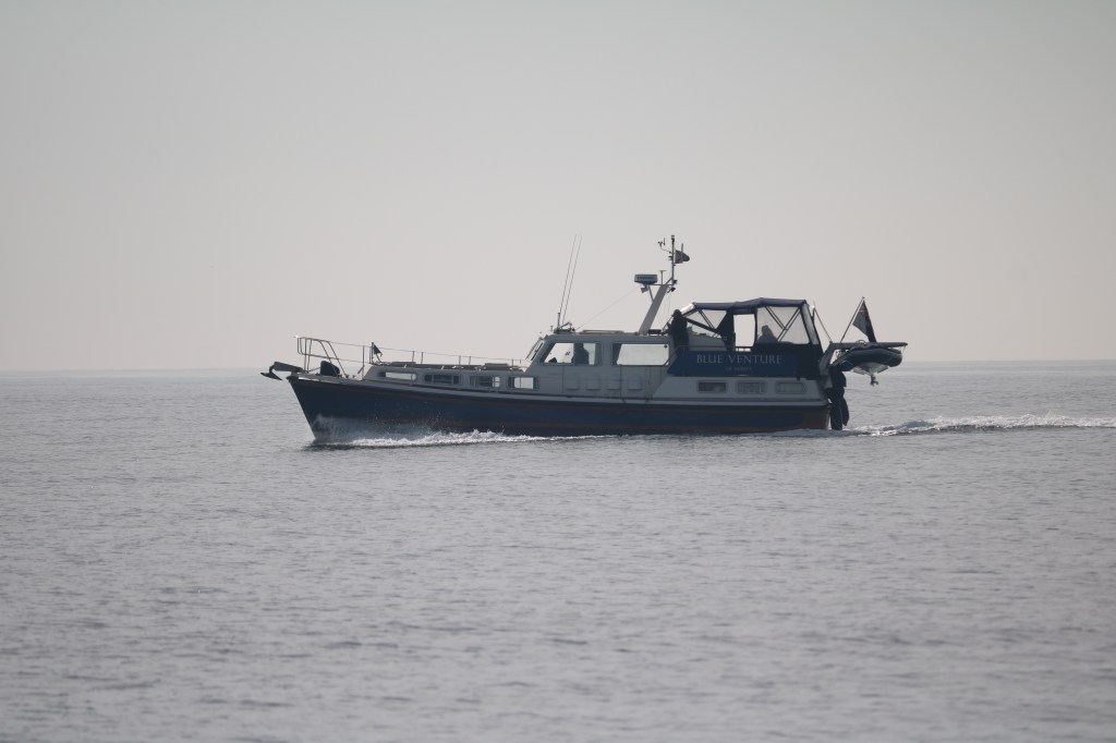 We set off at 0730 into the misty morning,  visibility about a mile or so.  Once past the Mew Stone we set our course and had little to do for the next nine hours.  The only highlights were dolphins,  on occasion, but they too seemed lethargic in the growing heat and none of came to play.