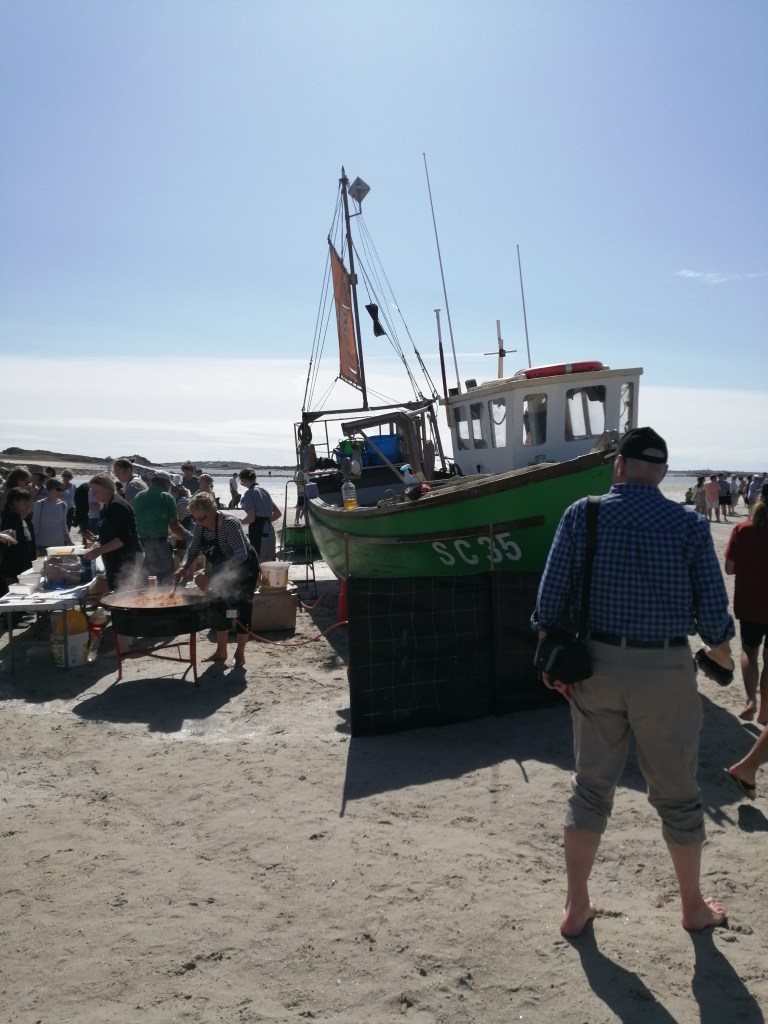 We joined in and were amongst the first hundred or so people to arrive. The first stall to be up and running was the Island Fish stall selling seafood paella, crab, lobster and prawn sandwiches. This had all arrived by the fishing boat which was now aground on the sandbank.
