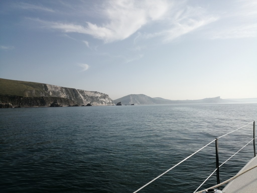 Monday was a better day in terms of the wind. A light South to South East wind providing a reasonable broad reach. We motored as far as Portland Bill and took the inshore passage turning into the tide. Main and Jib were set and we switched off the engine for the long downwind passage to Dartmouth.