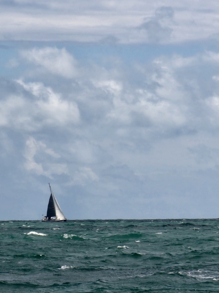 With full sails and sailing broad reach, come run, most of the way was OK. However the area south of Bolt Tail, and all along to Bolt Head is always a bit lively, and with the wind now at 18 to 20 knots with a spring tide flowing against it the swell was getting larger. At one point we got picked up by a particularly large wave and we surfed at nearly 11 knots for a good 30 seconds.