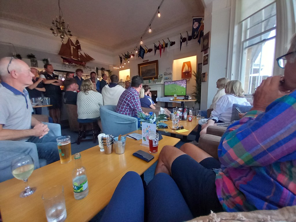 After mooring up in Salcombe. We went to the Salcombe Yacht Club, where we showered, had a meal, then settled back to watch England play Netherlands in the semi final. 2-1. best football England have played all tournament.