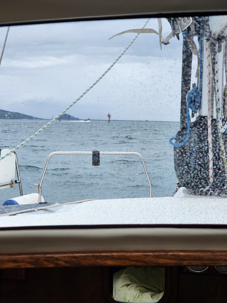 So wet weather gear on and off we set, one of only very few boats venturing out today. The light south easterly wind was not enough to sail so we motored all the way in a surprisingly lumpy sea. The coastline going in and out of sight as the showers passed though.