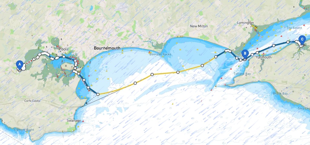 So it looks like we will be motoring a lot, but it’s a sunny day. We plan to leave at 11.00 to catch the tide at Wareham. We be at Poole Entrance around 12.30. but then we are have a foul tide the rest of the way.
