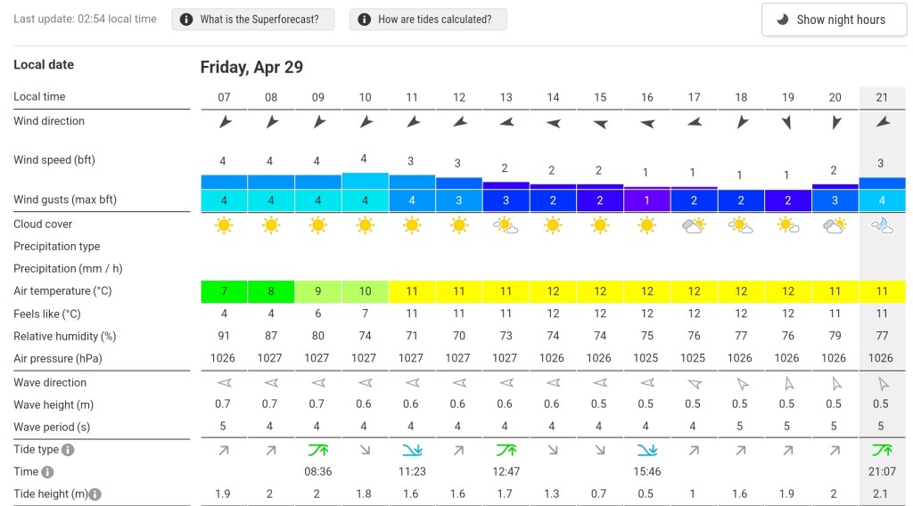 Route, weather and tide are as follows, (pictures paint a thousand words, click to enlarge.) I won’t bore you with too many details each post.