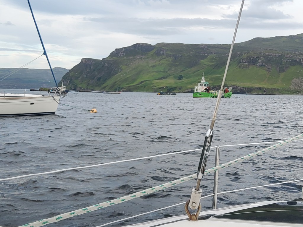 So to catch up, after another bad noisy night, we went to Portree, Skyes capital, where we found a bouy to hook up to, then promptly went ashore, where we had lunch in one of the many pubs in town. Portree obviously has very little interest in visiting yachts. There is a short pontoon which can be used to take on water, for £5. However if there is a cruise ship in the Loch then you cannot use it. There are no facilities for the visiting yachtsmen or women. Although after negotiation at the Iocal backpackers hostel in town we did manage to get a shower for £4.00 pp.